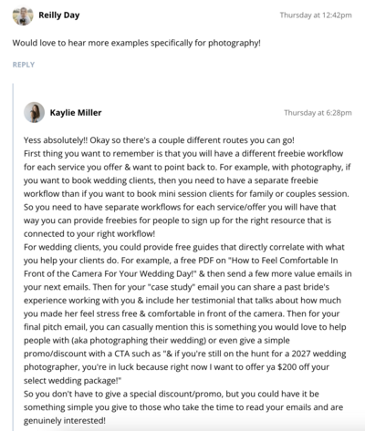 Reilly (a photographer) commented below a training on email marketing looking for more examples to relate to a photography business