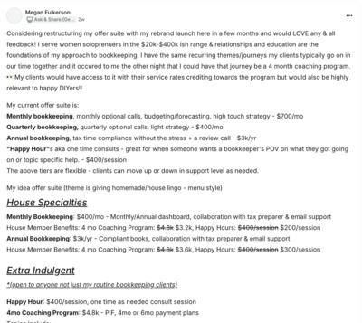 Megan is a bookkeeper & wanted some advice/opinions on how to restructure her services/offers for her clients so she posted her idea looking for input on the best route to go about it.